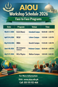 The AIOU Workshop Schedule 2026 for Face-to-Face Programs provides complete details of workshop dates, study centers, and course codes. It helps students attend mandatory sessions, interact with tutors, and successfully complete practical and academic requirements on time.